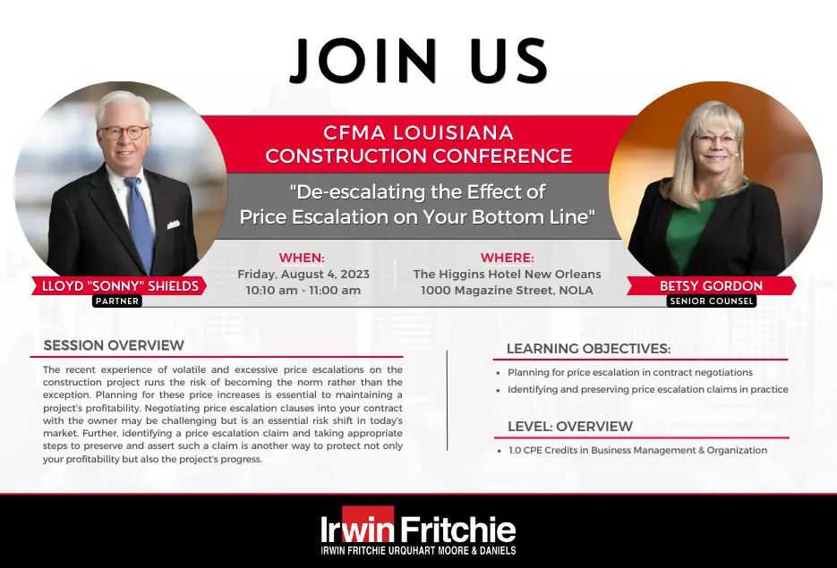 Sonny Shields & Betsy Gordon to Speak at the CFMA Louisiana Construction Conference in New Orleans in AugustPlanning to attend the CFMA Louisiana Construction Conference in New Orleans next week? Be sure to join Irwin Fritchie's own Lloyd "Sonny" Shields and Elizabeth "Betsy" Gordon for their discussion...