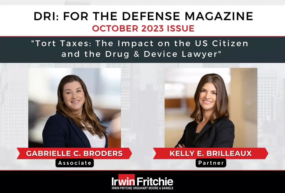Irwin Fritchie's Gabrielle Broders and Kelly Brilleaux Shed Light on the Impacts of Tort Taxes in DRI's For the Defense MagazineIn the October 2023 issue of DRI's For the Defense Magazine, Irwin Fritchie's Gabrielle Broders and Kelly Brilleaux discuss the impact tort taxes have on US Citizens and Drug & Device Attorneys.