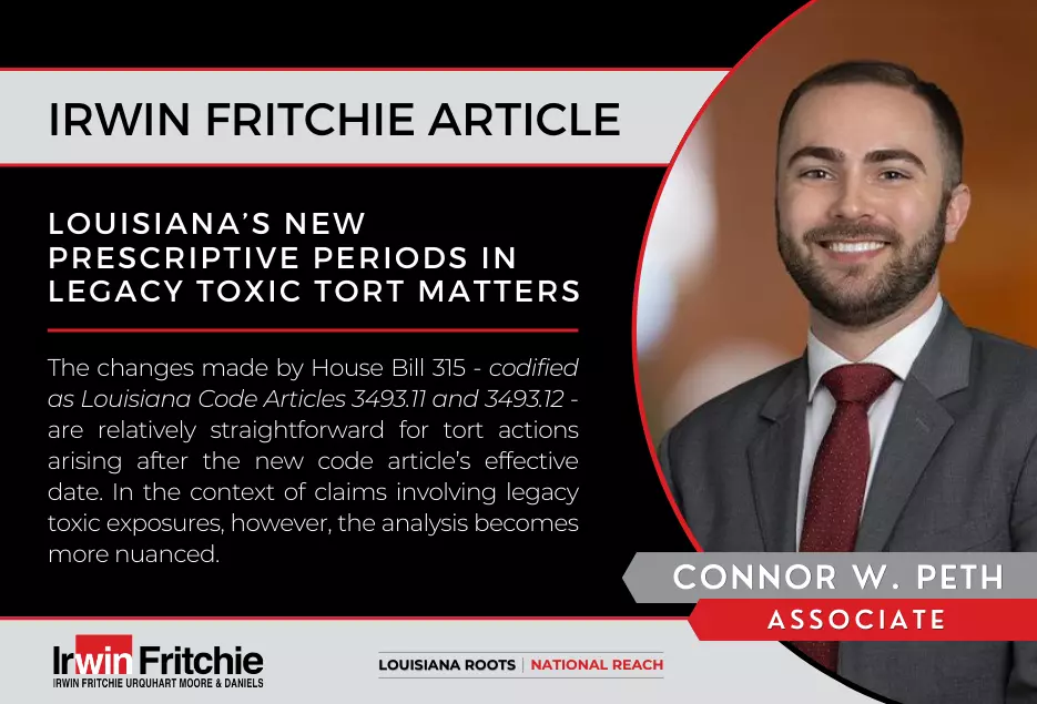 Louisiana’s New Prescriptive Periods in Legacy Toxic Tort MattersOn June 3, 2024, Louisiana Governor Jeff Landry signed into law House Bill 315 from the 2024 Regular Legislative Session. House Bill 315 extends the prescriptive period for tort actions in Louisiana from one year to two years, with some exceptions, and repealed Civil Code Articles 3492 and 3493. While this change is relatively straightforward for tort actions arising after the new code article’s effective date, in the context of claims involving legacy toxic exposures, the analysis is more nuanced.